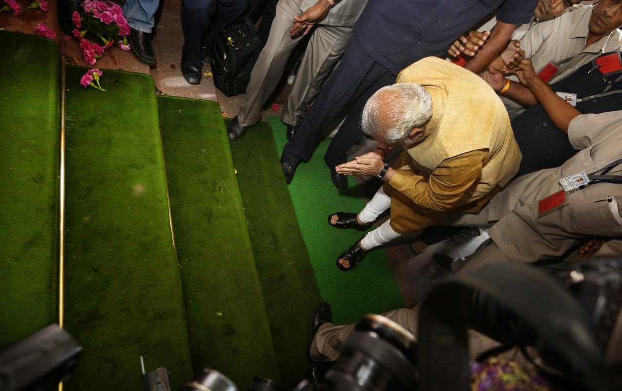 India’s next prime minister and Hindu nationalist Bharatiya Janata Party (BJP) leader Narendra Modi, bends down with folded hands on the steps of the Indian parliament building as a sign of respect as he arrives for the BJP parliamentary party meeting in New Delhi, India, Tuesday, May 20, 2014. The BJP has started putting together a new government by formally choosing Modi to be the country’s next prime minister following a resounding victory in national elections. (AP Photo/Manish Swarup)