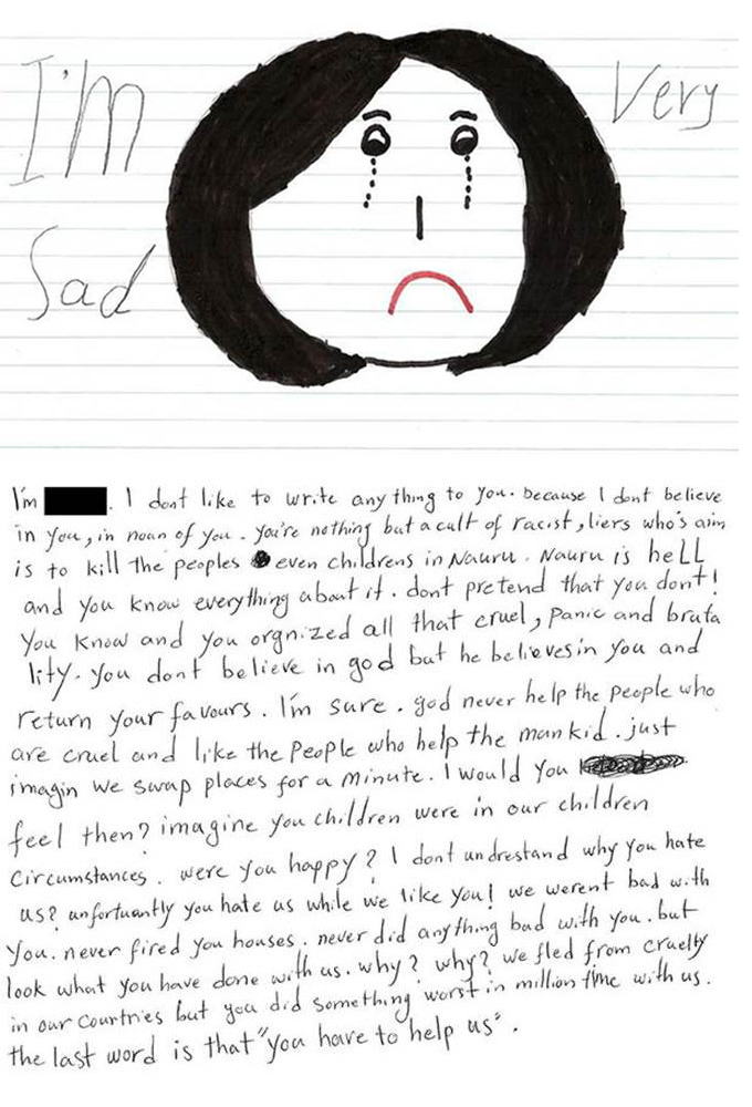 “You’re nothing but a cult of racist liers [sic] [whose] aim is to kill the peoples even children on Nauru,” wrote one child. “Nauru is hell and you know everything about it … imagine [if] your children were in … our circumstances.”