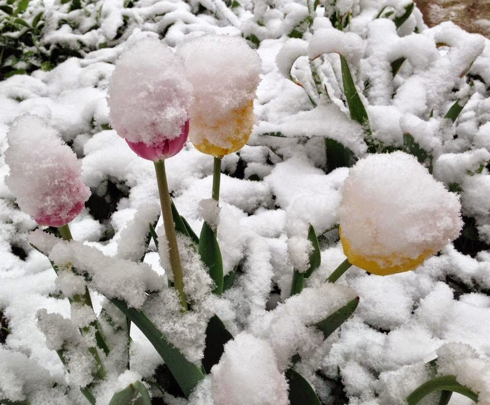Snow covers spring flowers in Denver on Monday, May 12, 2014. A spring