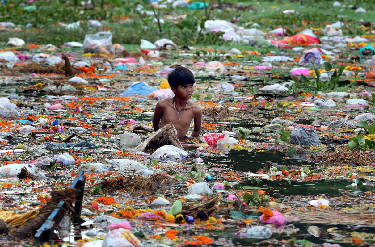 Young ragpickers collect clothes, coins, wooden materials and other usable items cluttered at the bank of the Jawahar Lal Nehru lake after the immersion of Lord Ganesh idols to mark the end of the Ganesh festival, in Bhopal, India, September 9, 2014. Despite of the warning of the district administration not to immerse idols in the lake to protect the environment, hundreds of idols have been immersed by devotees, resulting in a huge pollution of the lakes in India. (EPA/SANHEEV GUPTA)